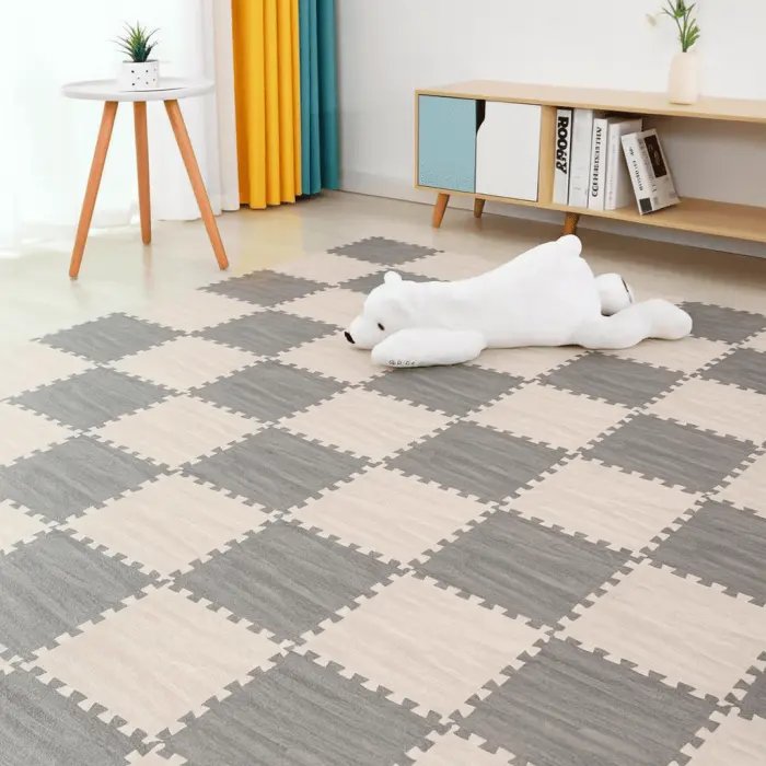 Nuestras placas de piso símil madera están fabricadas en GOMA EVA, un material flexible, resistente y cómodo al tacto, ideal para crear superficies seguras y estéticamente agradables. Su diseño en tonos gris y crudo (envío surtido) aporta un acabado moderno y armónico a cualquier ambiente.